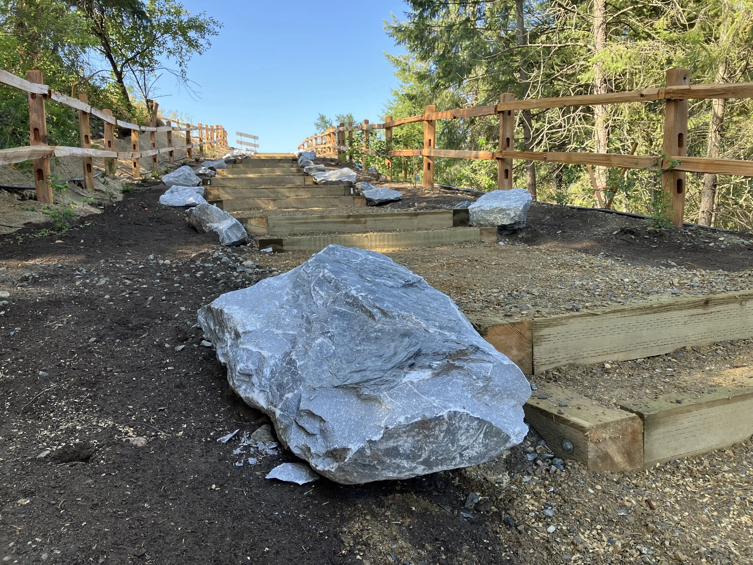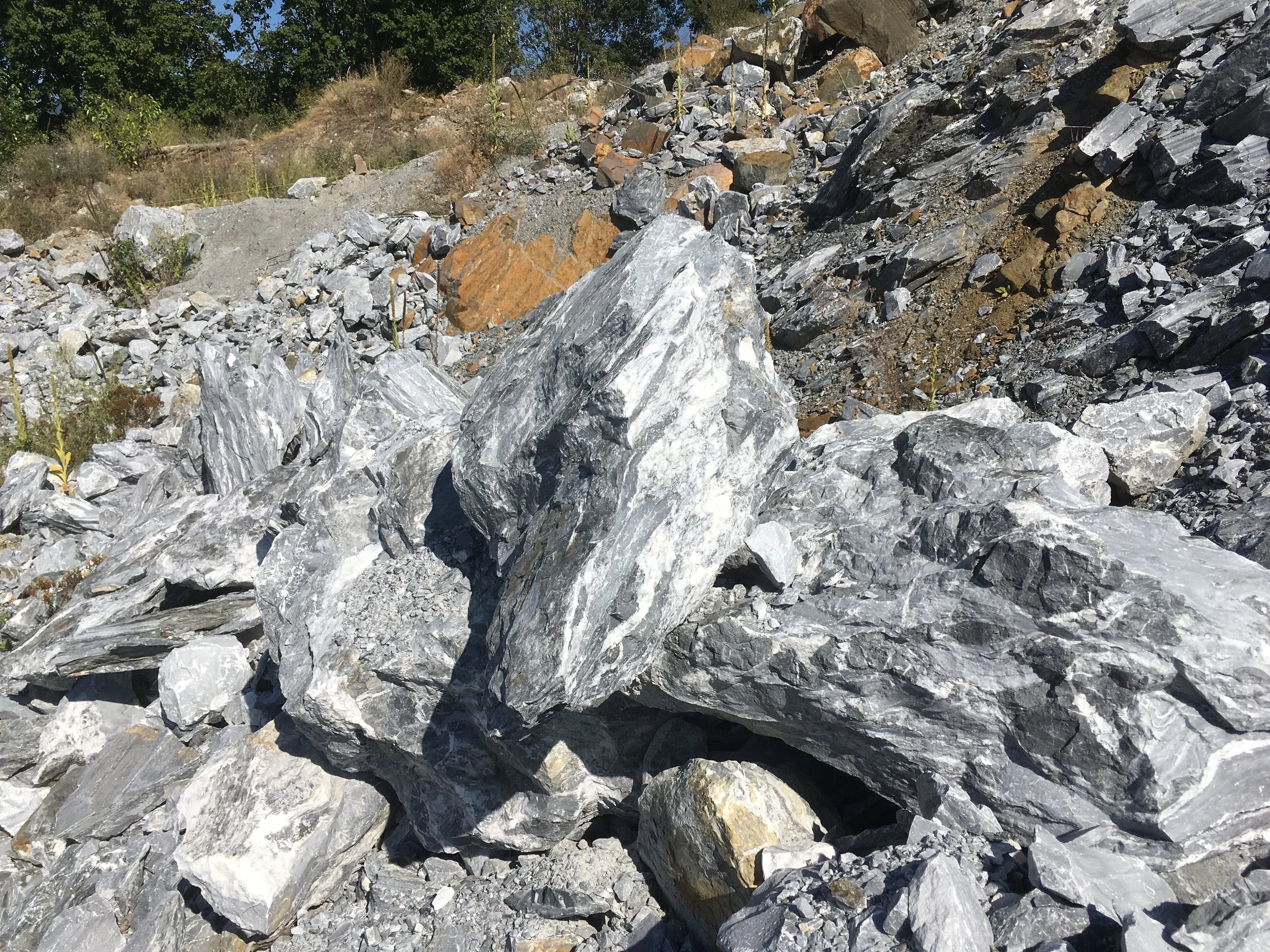 We produce visually striking boulders from our quarry, smoky gray in color with layers of thin white streaks. Please contact our Northport facility to make special arrangements for loading and handling.